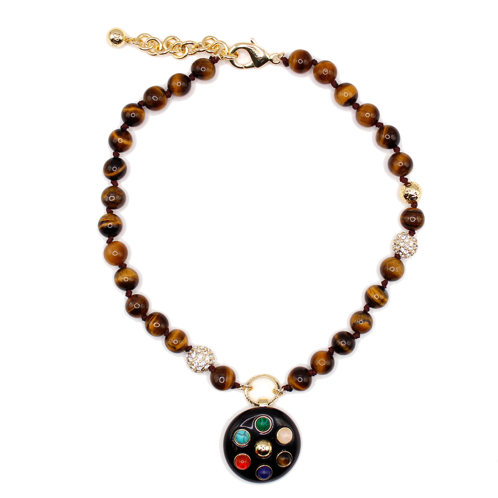 Meet Diana, one of the new Goddess styles in our 22'16 GODDESS Collection, Lulu Frost's most recent new collection inspired by goddesses - strong & beautiful women, both mythical and real.   Embrace the subtle energy of balance with The Diana Multi-Gemstone Charm Pendant, an elegant six-gemstone charm/pendant designed to capture the essence of light and harmony. This unique piece features a focused selection of six vibrant, round-cut gemstones, including tigerseye, rose quartz, malachite, turquoise, carnelian and lapiz lazuli set against a sleek, black resin disc setting. Each stone is meticulously placed in a contrasting gold-tone bezel setting, highlighting its individual beauty.