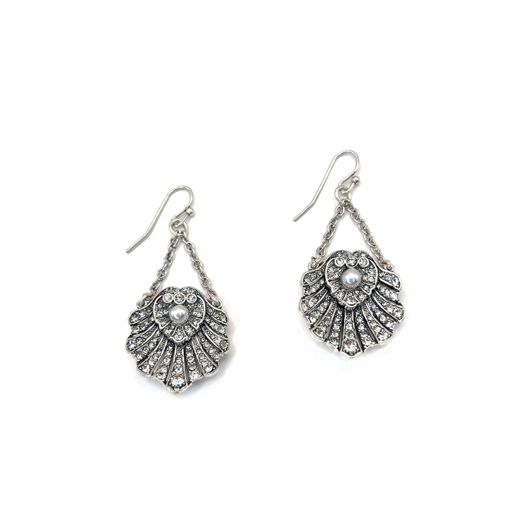 Channel timeless elegance with these intricate crystal dotted, silver-plated shell earrings. Featuring a gorgeous fan-shaped scalloped design reminiscent of the Art Deco era, each earring is encrusted with shimmering glass crystals that catch the light from every angle. At the heart of each shell sits a delicate, centered pearl, suspended from a dainty silver chain for graceful movement.  These earrings are inspired by the Botticelli painting The Birth of Venus, and we hope they inspire you to show off your personal beauty.