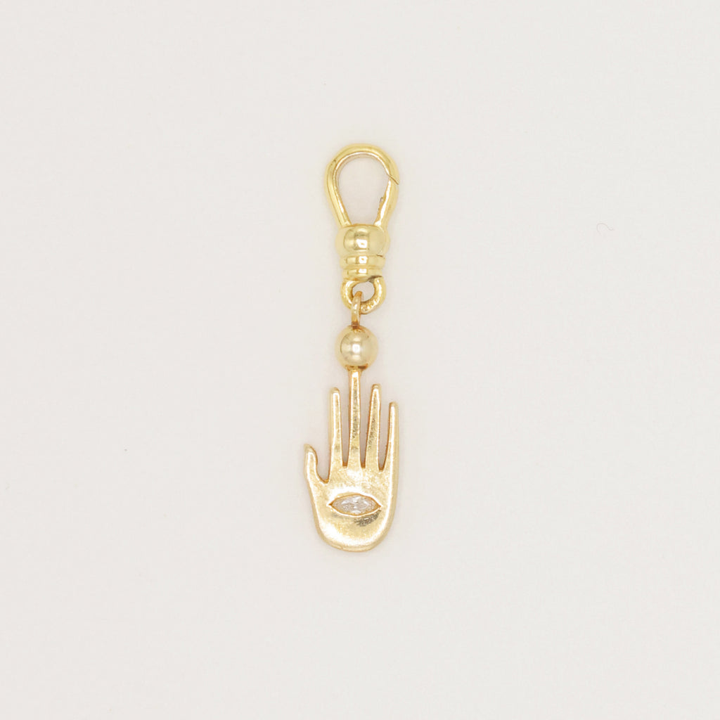 This classic charm is handmade in 14karat gold over sterling silver, with a marquise white sapphire "eye" in the middle of the hand, symbolizing protection.
